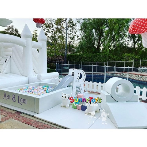 หลุมลูกบอลโฟมสีขาวพร้อมสไลด์ในร่มอุปกรณ์การเล่นแบบนุ่มสำหรับเด็กสำหรับงานเลี้ยงและโรงเรียนสนามเด็กเล่นเป่าลมสำหรับขาย